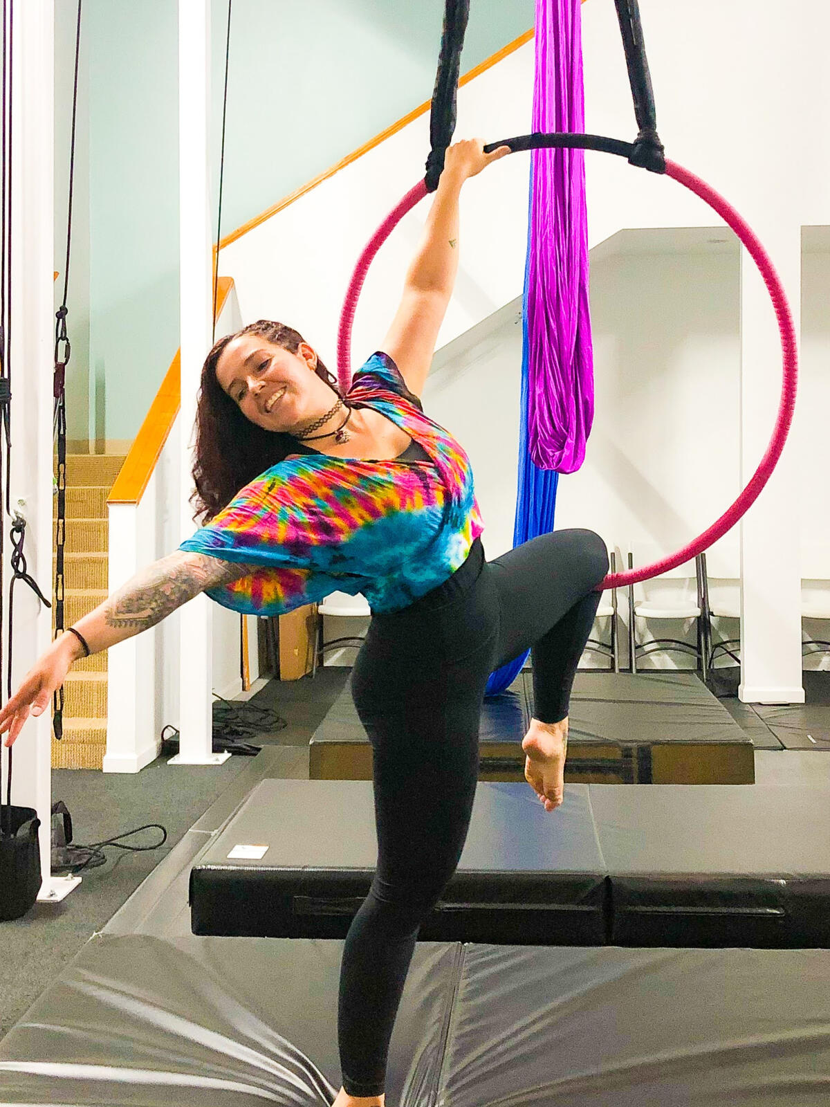Email Arika directly to book a private lesson arikamichelle33@gmail.com(Qualified to teach multi-apparatus' including sling, lyra, rope and silk, but you'll find her regular weekly classes as 'Single Point Lyra')Arika’s passion for movement and performing started at a young age with cheerleading and dance. Specializing in lyra, sling, rope, silks & dabbling on trapeze she also has an extensive knowledge on hand balancing and many different flow arts. A collegiate and national championship cheerleader, in 2014 Arika found yoga in her last year at North Carolina State University. (Go Pack🐺❤️🤘🏼) Yoga quickly turned into contortion training and one day while scrolling through Instagram she saw a woman practicing contortion on a lyra. She found the closest studio which happened to be Cirque De Vol Studios in Raleigh, NC and she signed up for a private lesson immediately with Gena DuBose studying lyra under her for about a year.Fast forward after a year or two of training on Lyra, silks and trapeze at Cirque De Vol, Chattanooga Aerials and Party Girl Dance and Fitness where she taught contortion and lyra. In 2016 Arika studied extensively through Volare Aerial Arts in San Diego on lyra and sling but she found out she was pregnant with her first child, her daughter, Saylor and moved back home to North Carolina to be closer to family.In 2018 she got certified in Rope and Silks through Born to Fly with Constance Palmer in Charlotte, NC. And through 2018-Oct 2020 Arika was the Creative Director and Studio Manager as well as full time performer and instructor for Cirque De Vol studios in Raleigh, NC.At the end of 2020 Arika moved back to the coast where she grew up after the birth of her son, Riot. Ultimately this brought her to Airotique in VA Beach. From the beginning of 2021 up until Airotique’s closing in May 2024 Arika has been teaching and performing sling, lyra, rope and silks for their company. Arika continues to thrive in her circus career. Performing all over Virginia and North Carolina doing aerial performances, flow arts, contortion, stilt walking, mermaiding ,balloon and bubble art and even face painting. She strives to make you laugh & showcase her ever evolving passion for circus and aerial arts to her students.