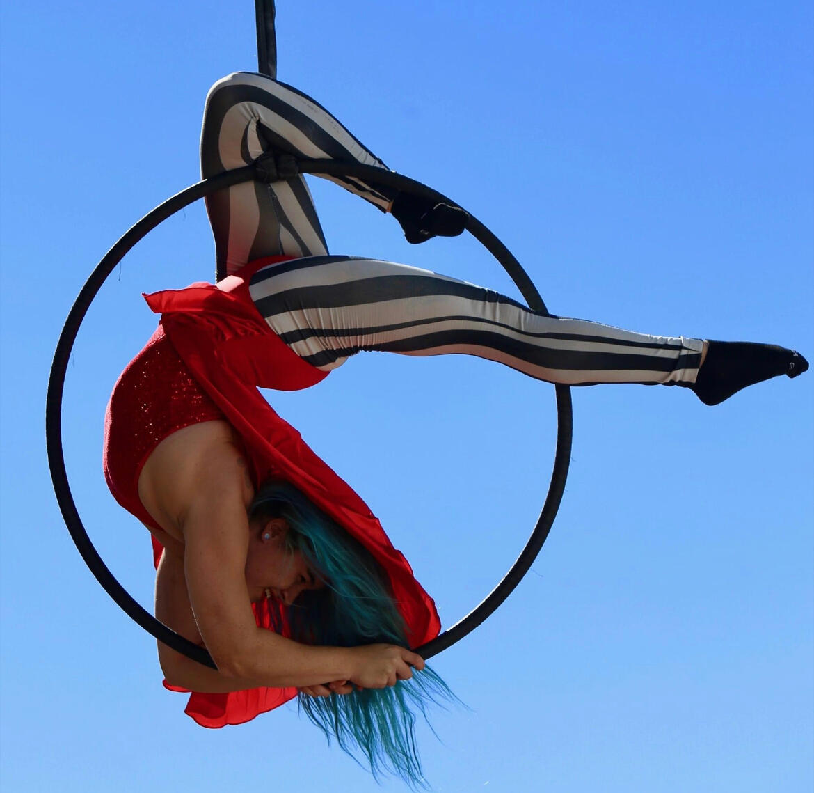--Aerial Hoop/Aerial Lyra is a metal hoop hung from either one point or two depending on the class. Its not a hula hoop! You can sit/stand/invert in this hoop and its also a great for beginners.
