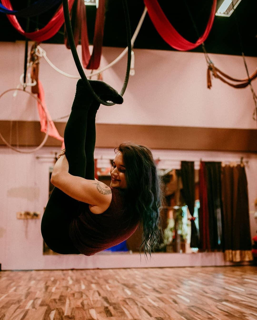 --Aerial Hammock/Aerial Sling is a long piece of fabric rigged from both ends so that it hangs like a swing. You can sit/stand/invert. It’s a great apparatus for beginners and many use it for yoga.