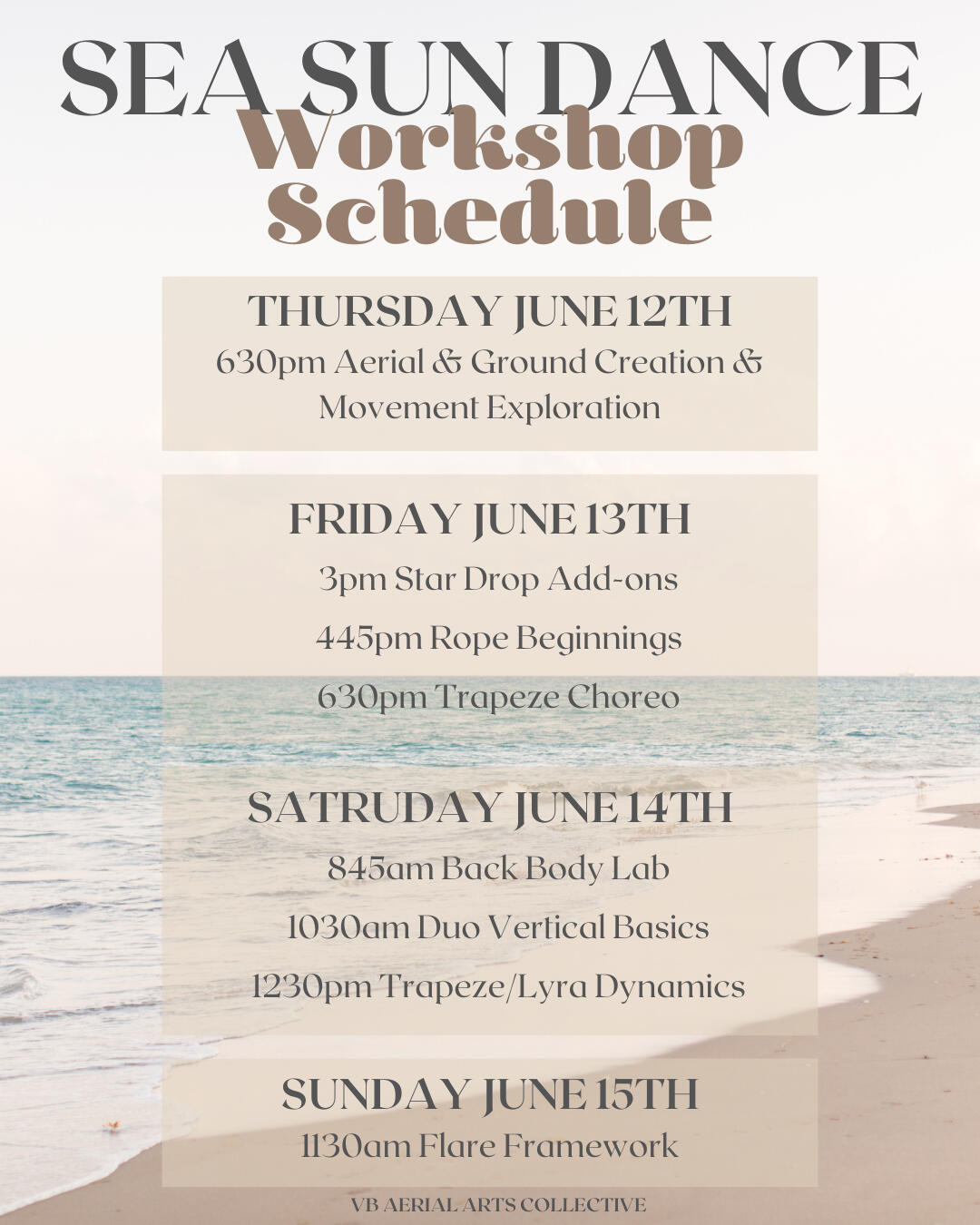 Special events & series cannot be rescheduled and do not offer make-ups. You man cancel for a full refund up to 7 days prior to the event start date (or starting date of the series). If cancelling within 7 days of the event start date (or starting date of the series) there are no refunds, no exceptions. No-shows will not be refunded, no exceptions. Please contact us if you need to cancel at vbaerialarts@gmail.com.