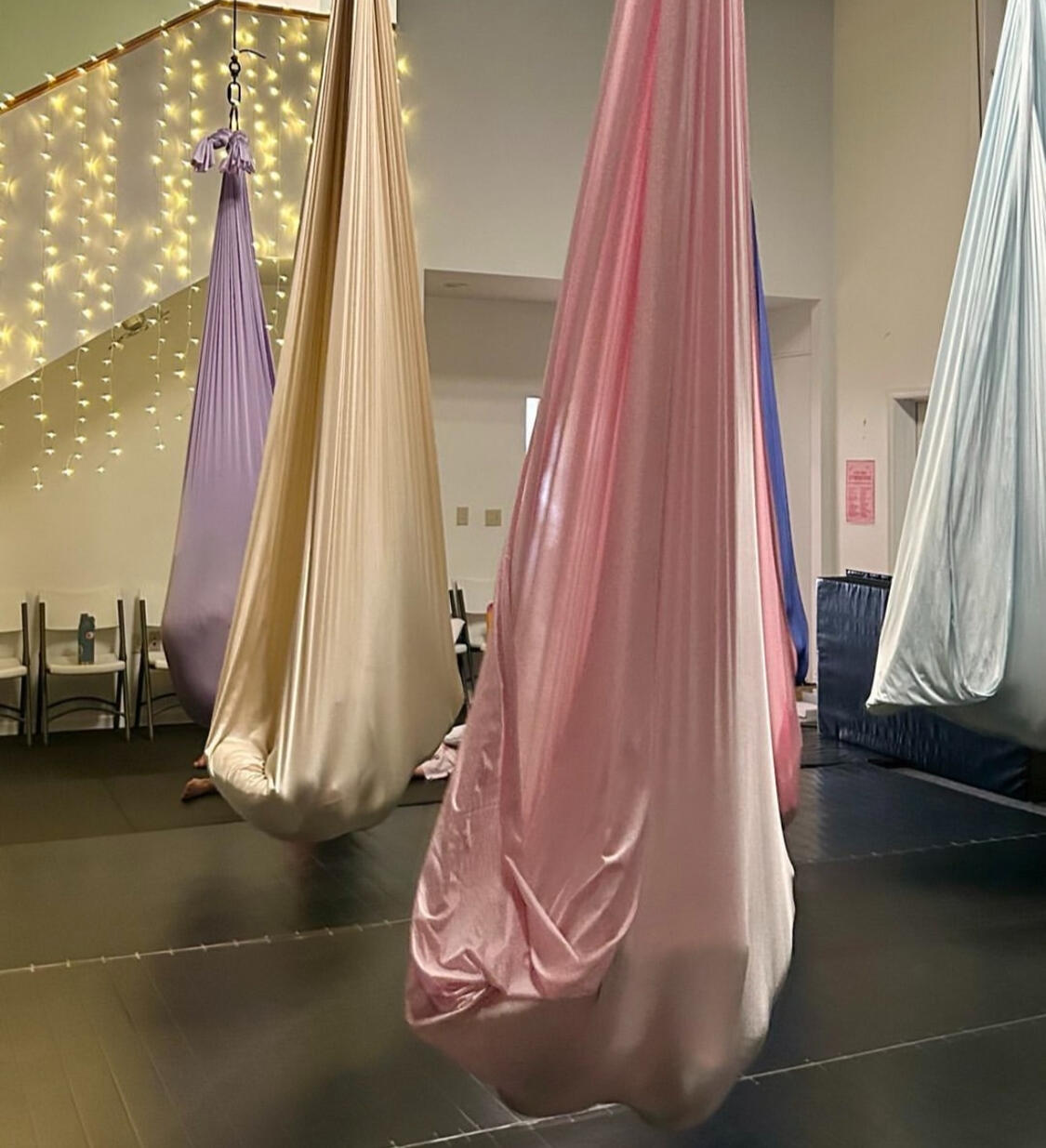 Students should have taken multiple beginner aerial yoga classes at this studio before attending. Students should know basic wraps and movements we used in beginner classes so this class can move smooth. There will be less time to instruct each individual position and more emphasis on flow and breath.